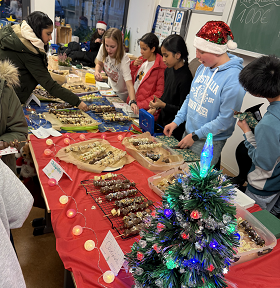 Am 28.11.25 wurde es weihnachtlich zum alljährlichen Adventsfreitag der 5.-7.Klassen. Zur Einstimmung wurde in der Aula unter großem Beifall das weihnachtliche Programm des Schulchors und BrassProjects, der Bläserklasse und Theater-AG honoriert. Im Anschluss boten in Trakt A die Klassen Selbstgebasteltes an. Mit herzhaften und süßen Köstlichkeiten war für das leibliche Wohl gesorgt. Vielen Dank an die Klassen- und Co-Klassenleitungen, die zusammen mit ihren Klassen und vielen Eltern gemeinsam den Basar vorbereitet haben. Wie immer gehen die Erlöse im Sinne der „doppelten Solidarität“ zur Hälfte zu gleichen Teilen an alle beteiligten Klassen und zur anderen Hälfte an ein örtliches wohltätiges Projekt, dieses Jahr: „Gemeinsam Weihnachten“. Wir danken allen Beteiligten für den stimmungsvollen Nachmittag!