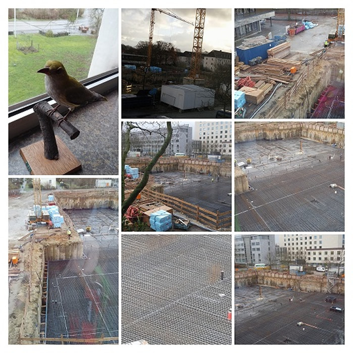 Während aus dem gesperrten Hauptgebäude letzte Überbleibsel wie der Pirol (Foto oben links) nach und nach umziehen, geht es auf der Baustelle für Trakt S (Sporthallen und MINT) täglich voran. Bei Flutlicht werden die Arbeiten am frühen Morgen begonnen und es sind täglich Fortschritte zu beobachten. Erfreulich ist, dass wir nach wie vor nicht unter Baulärm leiden, da nahezu alle Unterrichtsräume von der Baustelle abgewandt liegen. Auch im Jahr 2016 werden 14-tägige Baubesprechungen stattfinden, in denen der Fortschritt des Bauvorhabens koordiniert und begleitet wird. Nach einem Planungstreffen zur Einrichtung der unteren Etagen im September fanden im Oktober die Planungen für Elektro- und Medienausstattung statt. Auch die Fachgruppe Sport hat bereits die gewünschte Ausstattung der entstehenden Zweifeld- und der Gymnastikhalle geplant und an die Stadt Wolfsburg weitergeleitet. Auch bei der Planung des Neubaus des Hauptgebäudes gibt es Fortschritte: Im Oktober und Dezember gab es Termine mit der Stadt Wolfsburg und dem für den Planungswettbewerb zuständigen Architekturbüro, um letzte Details abzustimmen.