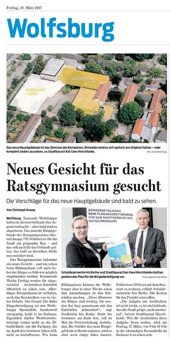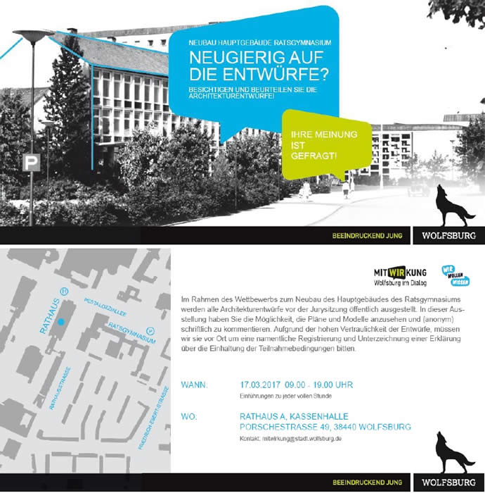 Vom 15.-17.03.2017 findet die Beteiligung im Rahmen des Planungswettbewerbs für den Neubau des Hauptgebäudes unserer Schule statt. Im Rahmen der gebundenen Beteiligung der Schulgemeinschaft gibt es folgende Termine: Am 15.03.2017 von 7.45 bis 15.00 Uhr: Jeweils eine Klasse der Jahrgänge 7, 8 und 9 sowie der Schülerratsvorstand besichtigen die Ausstellung. Von 17.00 bis 18.00 Uhr können die Mitglieder des Schulelternrats die Entwürfe sichten und kommentieren, die Einladung wurde über den SER versandt. Am 16.03.2017 findet für das gesamte Kollegium eine durch das Büro Luchterhandt organisierte Sichtung der Entwürfe ab 13.30 Uhr statt. Der Unterricht endet daher an diesem Tag nach der 6. Stunde, es findet keine Ganztagsbetreuung statt (vgl. Elternbrief). Am 17.03.2017 von 9.00 bis 19.00 Uhr sind alle interessierten Bürger im Rahmen der öffentlichen Beteiligung zum Besuch der Ausstellung eingeladen. Die Einladung zur öffentlichen Beteiligung veröffentlichen wir an dieser Stelle gern: