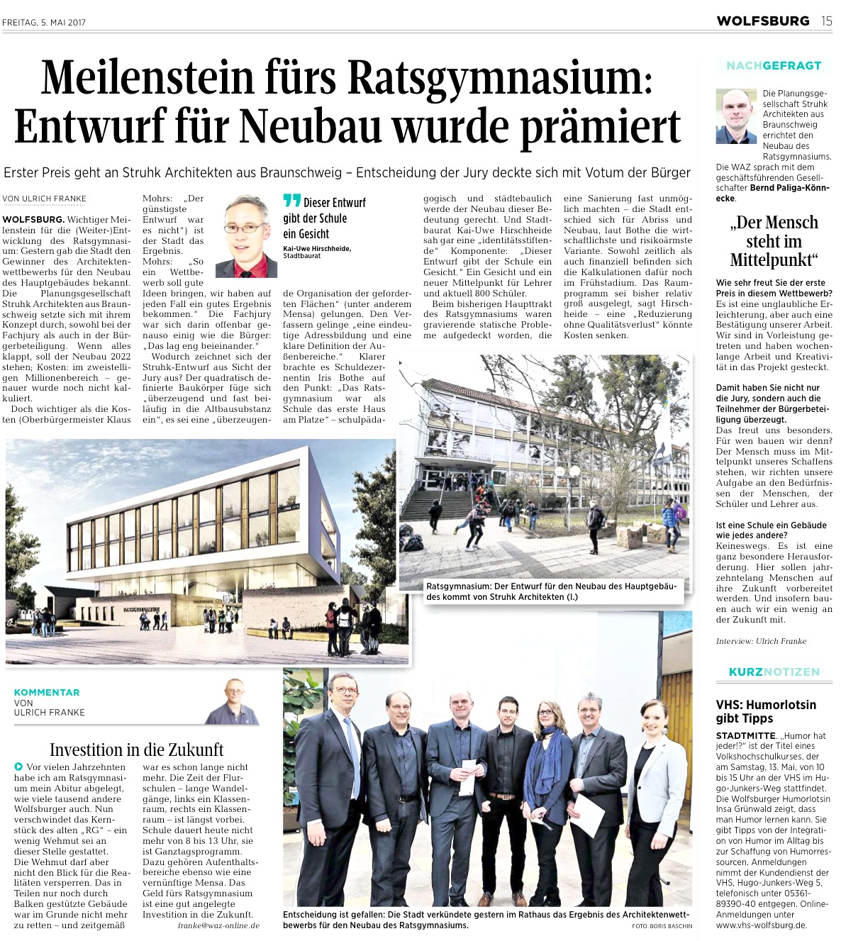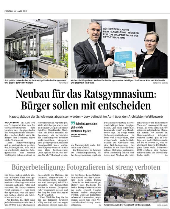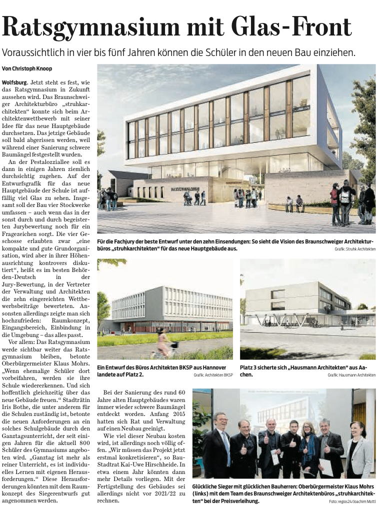 Im kommenden Schuljahr 2017/2018 wird der neue Trakt Sphäre S mit neuen naturwissenschaftlichen Räumen, einer Sport- und einer Gymnastikhalle, dem Lernstudio sowie acht allgemeinen Unterrichtsräumen in Nutzung gehen. Das Foto rechts zeigt diesen Neubau. Die NW-Räume ersetzen die Räume im alten NW-Trakt, der später ebenso wie das gesperrte und ungenutzte Hauptgebäude abgerissen werden wird. Damit vergrößert sich dann die Schulhoffläche. Das alte Hauptgebäude wird durch ein neues ersetzt (s. Beteiligungsprozess unten) und neben allgemeinen Unterrichtsräumen neue Kunst- und Musikräume sowie eine große Mensa beinhalten. Während der Bauphase fehlen zu keinem Zeitpunkt Räume, da das Hauptgebäude auch zur Zeit nicht genutzt wird. Am 04.05. fand die Prämierung des Siegerentwurfs für das neue Hauptgebäude im Rathaus statt. Lesen Sie hier die Presseberichte der Wolfsburger Nachrichten und der Wolfsburger Allgemeinen Zeitung. Sobald das Hauptgebäude fertig gestellt ist, ziehen die Jahrgänge QP1 und QP2 wieder mit an den Hauptstandort. Bis dahin stehen die gut ausgestatteten Räume im 3 min Fußweg entfernten Trakt K zur Verfügung.