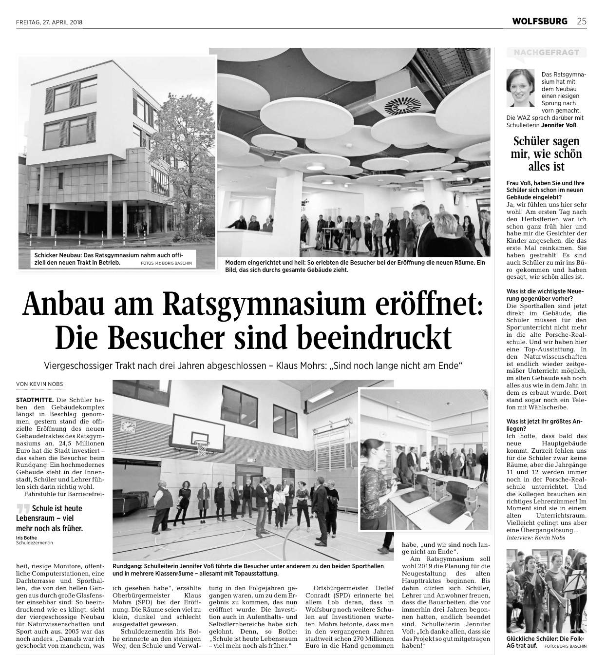 Bereits seit Oktober ist Trakt S mit der großen Zweifeldhalle, der Gymnastikhalle, acht Fachräumen für Biologie, Chemie, Informatik und Physik, dr Probebühne für Darstellendes Spiel und acht allgemeinen Unterrichtsräumen in Nutzung. Am 26. April weihte die Stadt Wolfsburg das Gebäude nun offiziell ein. Oberbürgermeister Klaus Mohrs, Stadträtin Iris Bothe, Ortsbürgermeister Detlef Conradt und Schulleiterin Jennifer Voß blickten auf die Planungs- und Bauphase zurück, bevor Gäste und Presse durch das neue Gebäude geführt wurden. Die Folk-AG umrahmte die Einweihung musikalisch. Lesen Sie hier die Berichte von WAZ und WN. Sehen Sie hier den Bericht von News38 inklusive einer Bildergalerie.