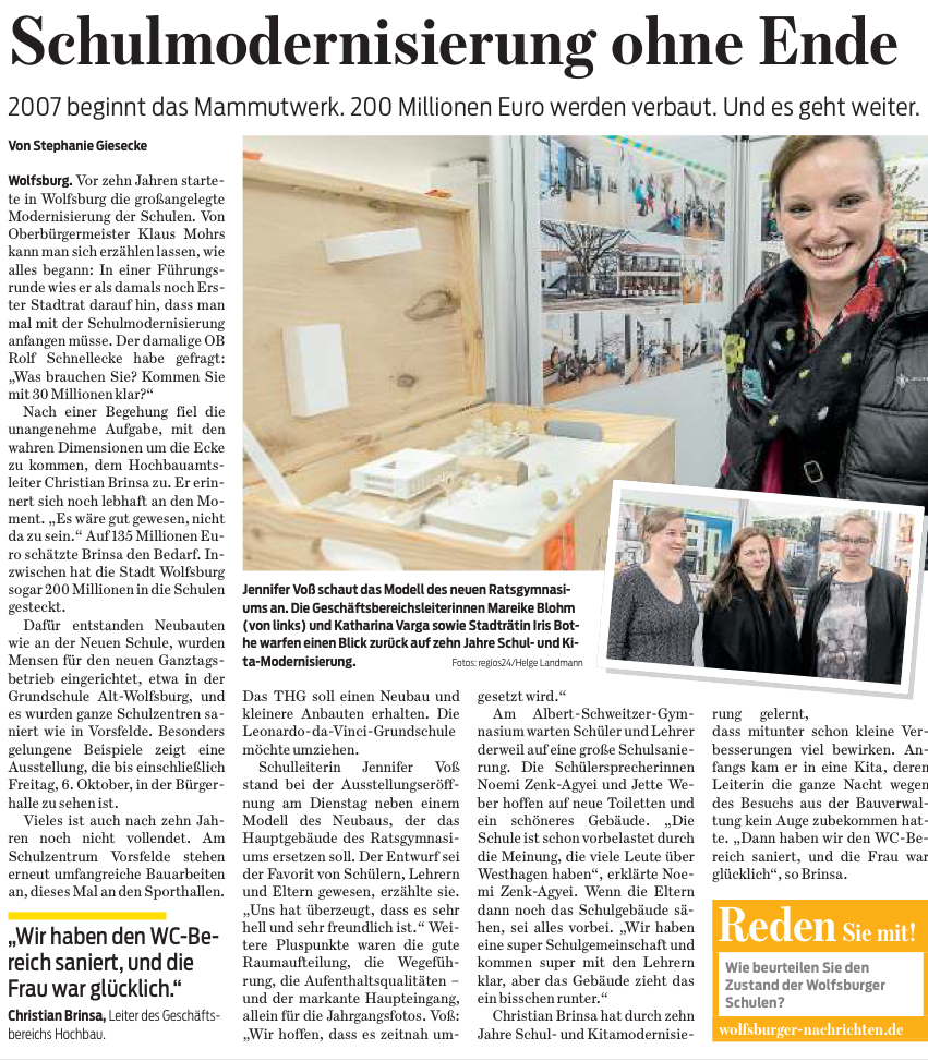 Fotos von Sphäre 5/6, Videos vom Bau der Sphäre S und das Modell des Entwurfs für den Neubau des Hauptgebäudes sind drei Elemente, mit denen das Ratsgymnasium in der Ausstellung "Wolfsburg baut auf Bildung", die seit dem 26.09. in der Bürgerhalle des Rathauses zu sehen ist, vertreten ist. Am Dienstag eröffneten Oberbürgermeister Klaus Mohrs,Stadträtin Iris Bothe, Dr. Christian Brinsa (Hochbau) und Mareike Blohm (GB Schule) die Ausstellung, welche die Ergebnisse der Baumaßnahmen im Bereich Schule und KiTa der vergangenen zehn Jahre in Wolsburg zeigt. Das Bild rechts zeigt den Entwurf für den Neubau des Hauptgebäudes vor den Bildern der 2012 fertig gestellten Sphäre 5/6. Pressebericht zur Ausstellungseröffnung der WN vom 27.09.17. Während die Ausstellung im Rathaus läuft, finden die abschließenden Arbeiten in Sphäre S statt: Am 16. Oktober wird dort der Unterricht in den Naturwissenschaften, Sport, Darstellendem Spiel und für die 10. Klassen in drei neuen Klassenräumen starten.