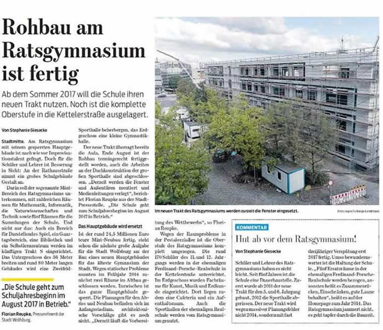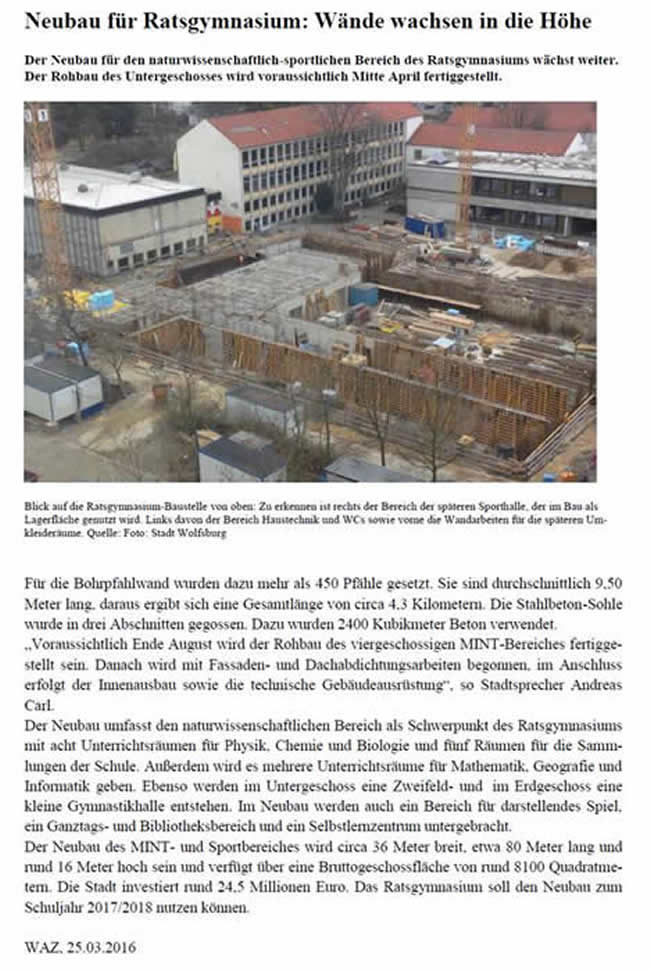 Pressemitteilung der Stadt Wolfsburg zum aktuellen Baufortschritt am Ratsgymnasium: