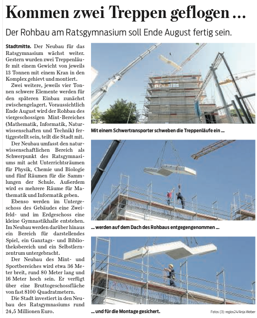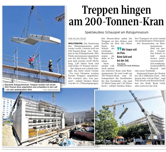 Im Juli 2016 wurden vier Treppenläufe im Rohbau der im Bau befindlichen "Sphäre S" installiert. Der Neubau ist voll im Zeitplan. Über die Montage der Treppen gibt es sogar einen youtube-Film der Stadt Wolfsburg: Video Einbau der Treppenläufe am Ratsgymnasium Wolfsburg (youtube).