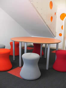 Das untere Foto zeigt einen Aufenthaltsbereich von Schülern der 5. und 6. Klassen. Der Teppich ist ein zertifiziertes c2c-Produkt. Die Fa. DESSO aus den Niederlanden hat den Teppich hergestellt und nimmt verschlissene Teppichfliesen nach Gebrauch zurück. In einem technischen Kreislauf wird erneut ein gleichwertiges Produkt produziert.