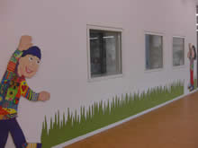 Die Schüler der AG Denk*mal! und Frau Frank verschönern immer mal wieder verschmuddelte Wände in den Trakten A und B mit der Akustiktapete Buzziskin (Foto: zum Beispiel die "Graskante zwischen den Figuren Felix und Felicitas"), denn das Pinnwand-material aus recycltem PET (siehe unten c2c-Pinnwände) gibt es auch als selbstklebendes Material von der Rolle und wird zur kreativen Gebäudegestaltung in der AG verwendet.
